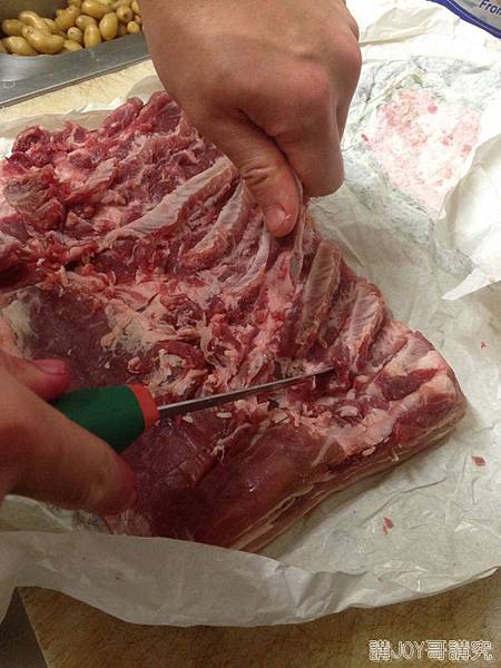 法國這裡的五花肉(Poitrine de porc)通常都會帶骨,要用去骨刀一根根把骨頭挑出來,