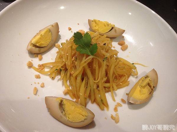 前菜哥是把拌好的土豆絲擺中間,切一個滷蛋圍在四週,上頭裝飾一抹香菜葉,