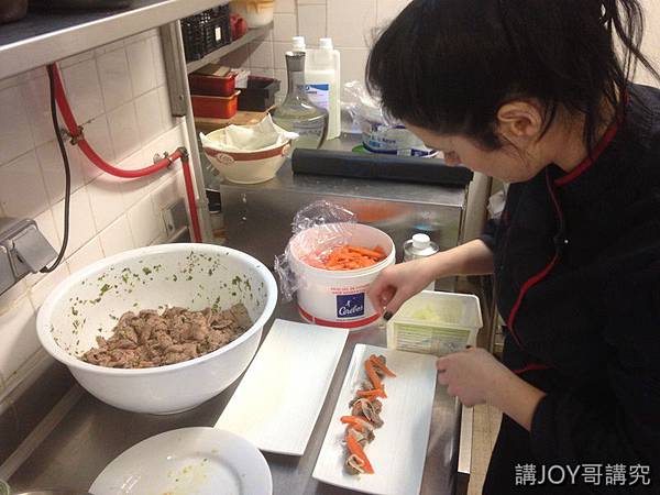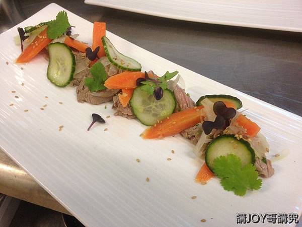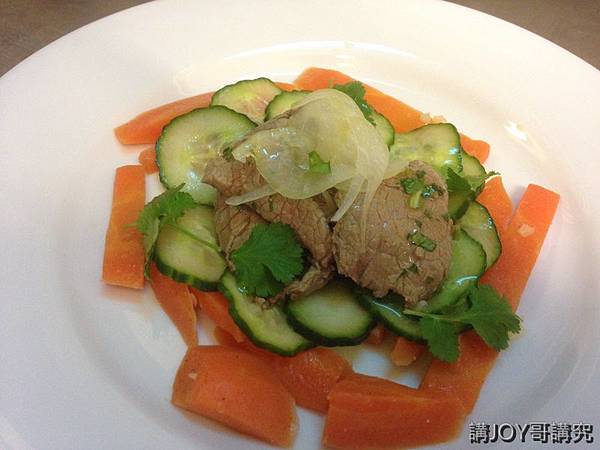 此外當哥在準備前菜時,將牛肉切片入水汆燙,拌上醬汁,