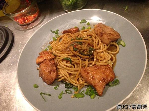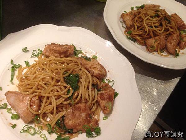Chef看哥忙不過來趕緊來協助哥擺盤,雖然三杯雞炒麵的盤飾有點差強人意,