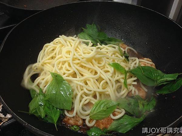 再下雞肉煸炒上色,淋上醬油燒煮入味,最後加進大把九層塔葉,